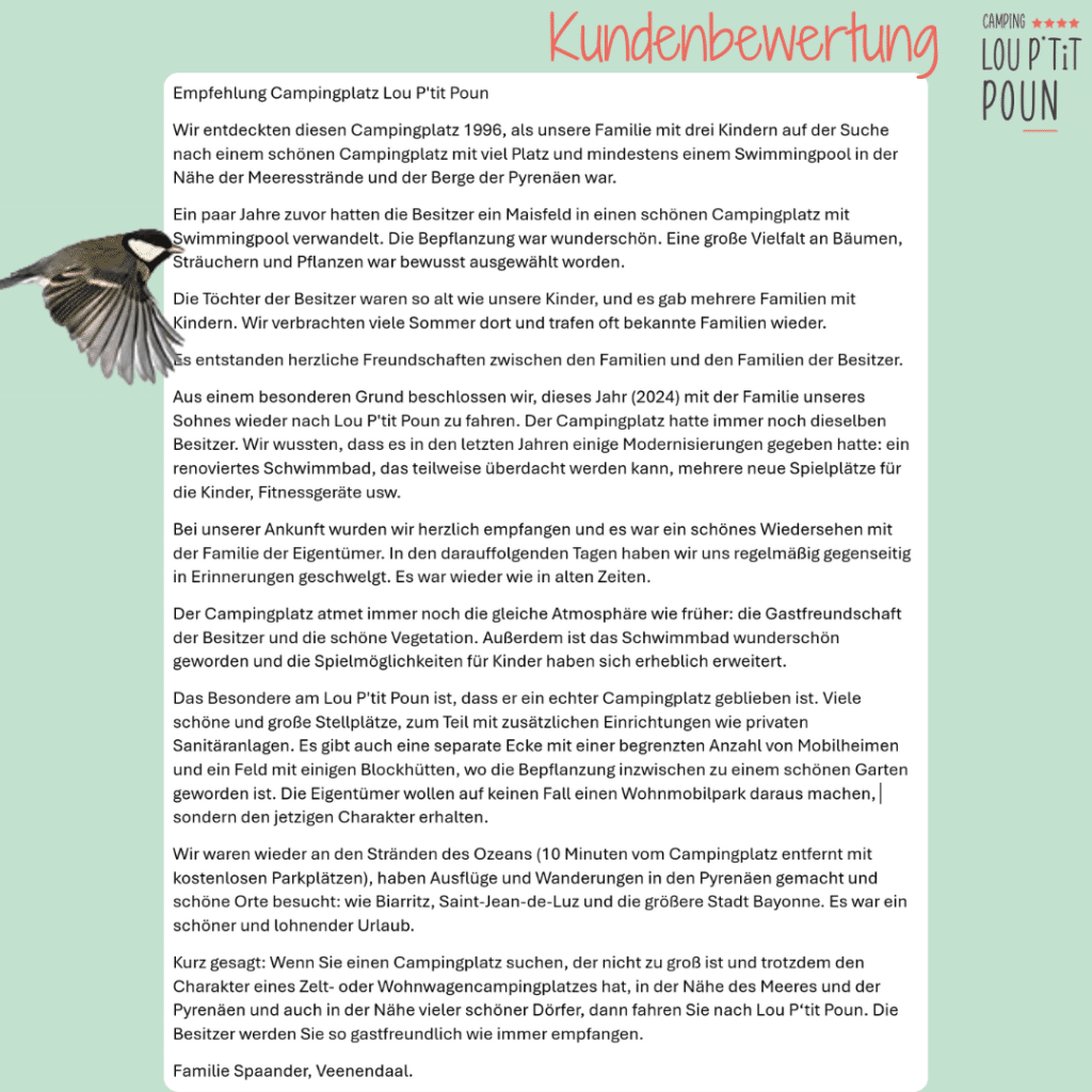 Die MeinungVon unseren Kunden Finden Sie heraus, was unsere Gäste über ihren Aufenthalt auf unserem Campingplatz in der Nähe von Bayonne .